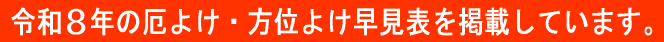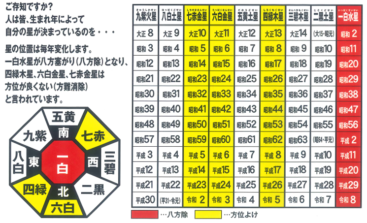 八方除けは、日柄、地相、家相、方位等からくる一切の悪事災難を取り除くご祈願です。自身が持つ運命星の星回りが中央に位置すると「八方塞がり」となります。運命星の星回りに加え、日柄、地相、家相、方位等から様々な災いを受ける年といわれます。八方塞がりの年に物事を新しく始める、あるいは今までの生活環境が変わるという場合は特に注意が必要です。