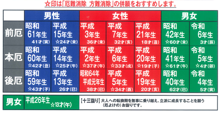 男性の25歳、42歳、61歳、女性の19歳、33歳、37歳、61歳を本厄といい、「本厄」の一つ前の年を「前厄」、「本厄」の一つ次の年を「後厄」といいます。とくに、男性の42歳と女性の33歳は「大厄(たいやく)」といって最も慎重に過ごすべきとされています。
