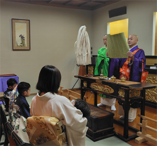七五三の特別祈祷を執り行い、お子様の身体健全・学徳向上をご祈念致します。ご祈祷は11月以外でもお受け致しますので、詳細は当山までご連絡ください。記念品として、デジカメ写真・お手形(特製台紙つき)・文具セットがつきます。