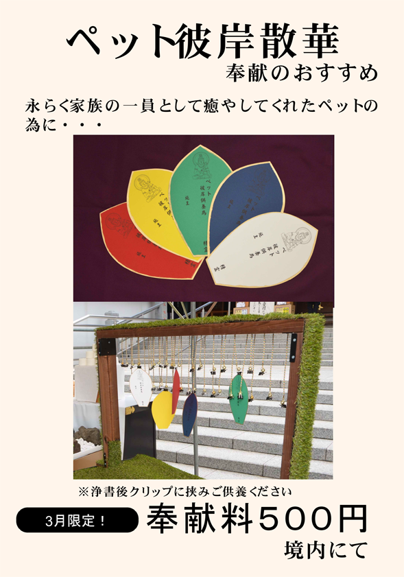 | 永らく家族の一員として癒やしてくれたペットの彼岸法要を下記の通り厳修致します。この機会に是非ご参列ください。 |