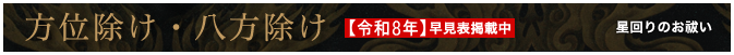 八方除けは、日柄、地相、家相、方位等からくる一切の悪事災難を取り除くご祈願です。自身が持つ運命星の星回りが中央に位置すると「八方塞がり」となります。運命星の星回りに加え、日柄、地相、家相、方位等から様々な災いを受ける年といわれます。八方塞がりの年に物事を新しく始める、あるいは今までの生活環境が変わるという場合は特に注意が必要です。