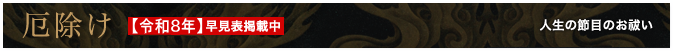 古来、厄年は心や体、身辺を取り巻く人間関係や環境などで大きな変化が生じる、人生の節目といわれています。「厄」は「役」に通じることから、大いなる飛躍の可能性を秘めた大切な時期であると同時に、不安定さゆえに体調を崩しやすく、思わぬ災難に遭う時期であるともいえます。こうした節目を迎えるにあたり、身を清め、行いを慎み、諸々の災いが好機となるよう御本尊お不動様に祈願しましょう。